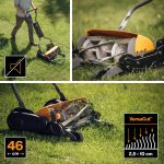Высота среза легко регулируется в диапазоне от 2,5 до 10 см. Это позволяет адаптировать инструмент к любым условиям — от нежного газона до более жестких участков с высокой травой. Простая настройка высоты рукоятки и ее мягкое покрытие обеспечивают комфортный захват и снижают усталость во время работы.