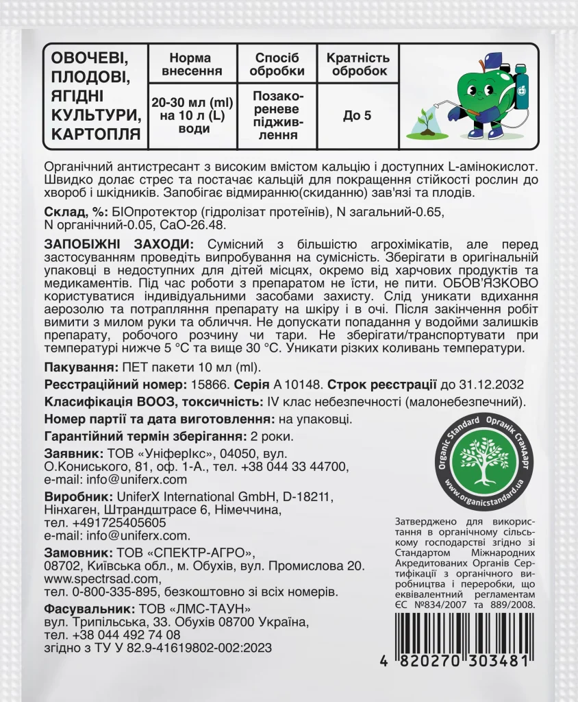 Антистресант Вегано Кальций — это органический биостимулятор, созданный на основе натуральных компонентов, таких как биопротектор (гидролизат протеинов) с высоким содержанием кальция и доступных L-аминокислот. Продукт является безопасным для людей и полезной энтомофауны.