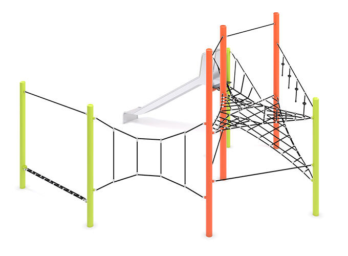 Конструкція складається з декількох секцій мотузкових переходів — підвісної мережі у вигляді павутини, хитких мотузкових доріжок та тросових елементів — які вимагають від дитини уважності, точності рухів та злагодженої роботи всіх груп м’язів. Після проходження “канатного маршруту” дитина має можливість винагородити себе веселим спуском з гірки з неіржавної сталі, що додає грі динаміки й задоволення.