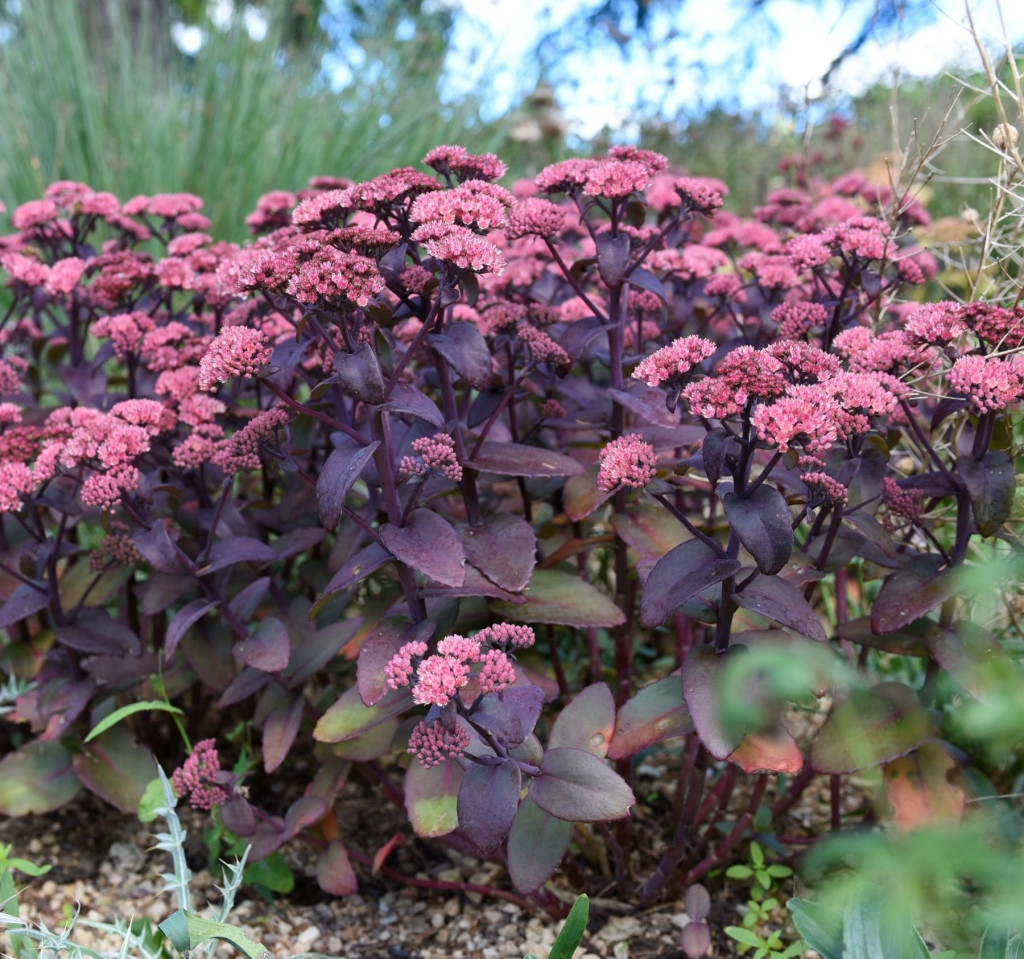 Кущ висотою 40–50 см, із міцними стеблами, густим листям насиченого пурпурово-зеленого відтінку та щільними зонтичними суцвіттями діаметром до 15 см. Цвітіння триває з серпня до жовтня, коли очиток рясно вкривається квітами темно-рожевого, майже винного кольору. Навіть після цвітіння суцвіття зберігають декоративність, прикрашаючи сад до зими.