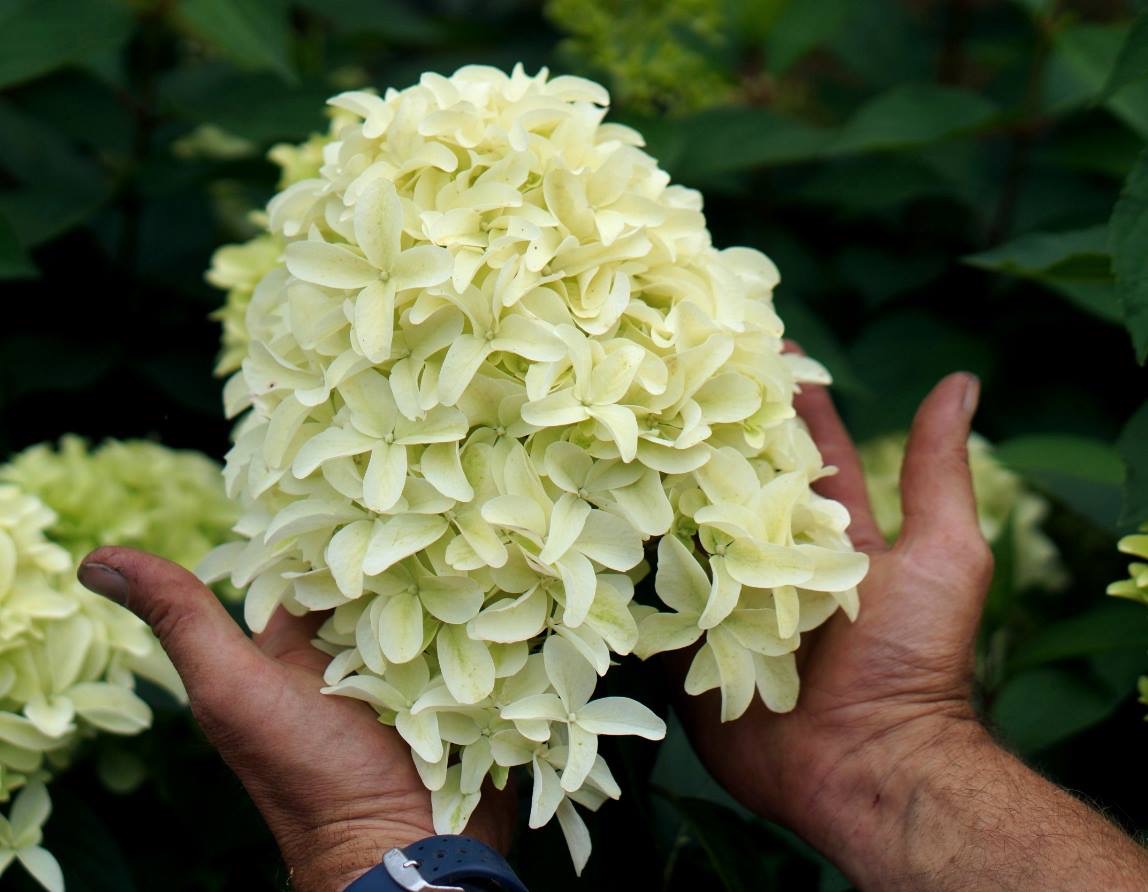 Кущ Hydrangea paniculata ‘Skyfall’ відзначається потужним ростом і водночас акуратною, добре сформованою кроною. У дорослому віці рослина досягає приблизно 1,5–2 метрів у висоту і ширину, утворюючи гармонійний, пропорційний силует. Пагони товсті, міцні, прямостоячі, чудово утримують масивні суцвіття і не вилягають навіть після сильних дощів. Завдяки цьому гортензія “Скайфол” зберігає охайний вигляд протягом усього сезону і не потребує додаткових опор.