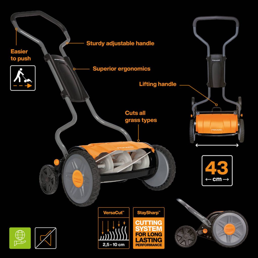 Механічна газонокосарка Fiskars StaySharp™ Plus – це розумний вибір для тих, хто цінує якість, тишу та екологічність. Забудьте про бензинові та електричні аналоги – насолоджуйтесь природною тишею та бездоганним результатом з механічною газонокосаркою Fiskars.