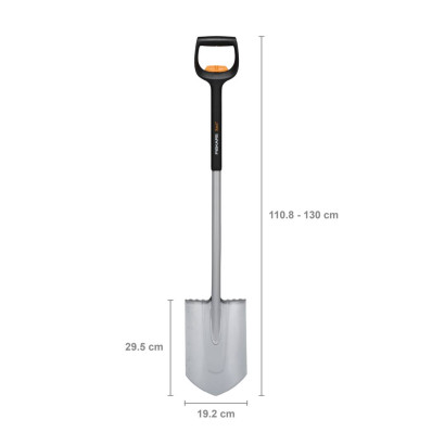 Довжина держала може бути налаштована від 110,8 см до 130 см. Ця надзвичайно міцна лопата оснащена ступінчастим упором, загостреним кінчиком та загостреними краями, які легко проникають у тверду землю. D-подібна ручка SoftGrip™ забезпечує чудовий контроль під час копання. Легкі, але надзвичайно міцні інструменти Fiskars Xact™ працюють у гармонії з рухами вашого тіла.