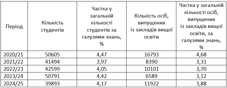 Уже в 2021–2022 роках році цей показник зменшився до 41 494 осіб (3,97%). У наступні два роки  відбулося часткове відновлення. У 2024–2025 навчальному році кількість студентів знову скоротилася до 39 893 осіб, однак їхня частка майже не змінилася й становила 4,17%.